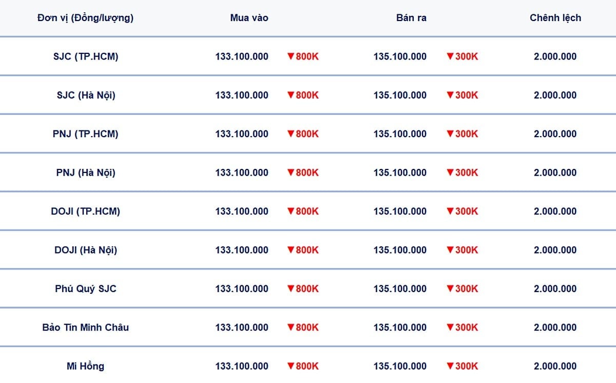 Cuối ngày 8-9, giá vàng miếng SJC được các công ty lớn niêm yết ở mức 133,1 triệu đồng/lượng mua vào, 135,1 triệu đồng/lượng bán ra – giảm 300.000 đồng so với hôm trước.