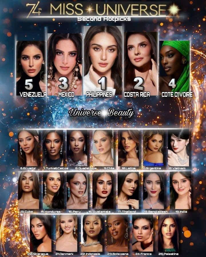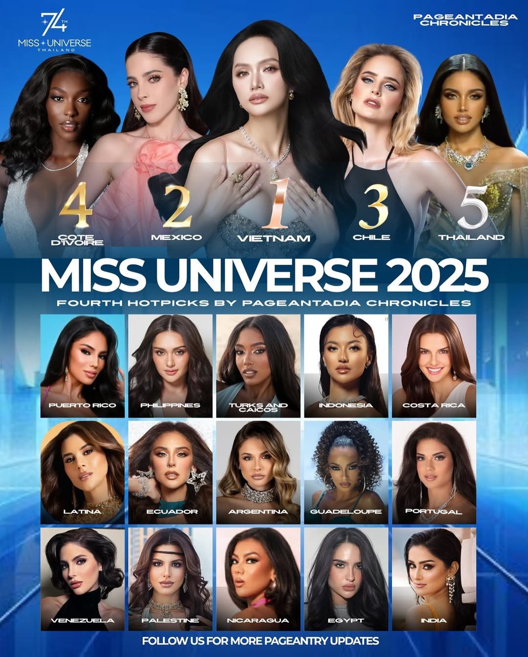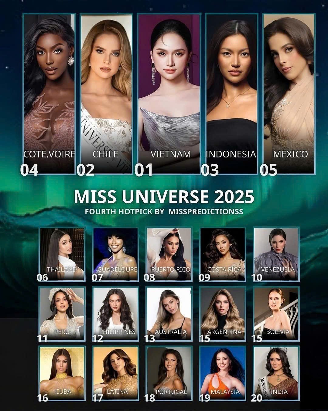 Ngay từ khi công bố đại diện, hàng loạt chuyên trang sắc đẹp quốc tế đã nhanh chóng đưa Hương Giang vào danh sách ứng cử viên tiềm năng. Thậm chí, có bảng dự đoán còn đặt cô ở vị trí số một cho ngôi vị Hoa hậu Hoàn vũ 2025. Điều này cho thấy sức hút và lợi thế truyền thông mạnh mẽ mà Hương Giang đang nắm giữ.